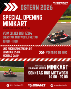 Zusätzliche Öffnungszeiten am Morgen! Für die Osterferien und -feiertage haben wir spezielle Zusatzzeiten für die Minikart-Kinder (8–13 Jahre und ab 130 cm) geplant: