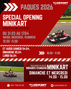 Ouverture supplémentaire le MATIN! Pour les vacances et les fêtes de Pâques, nous avons prévu des horaires supplémentaires spéciaux pour les enfants Minikart (8–13 ans et à partir de 130 cm) :